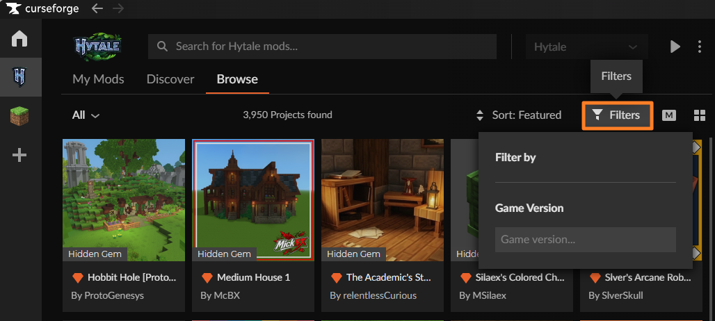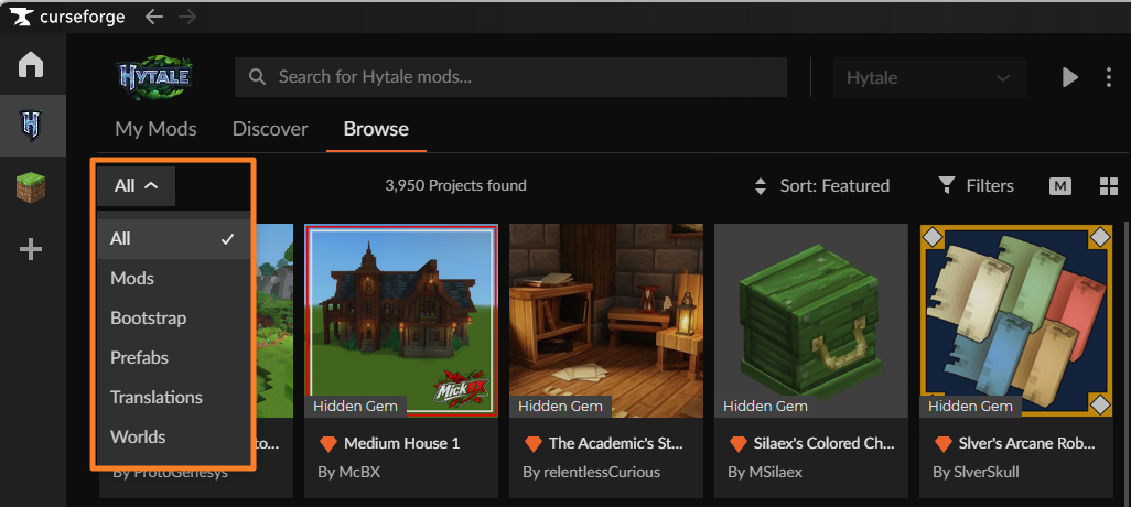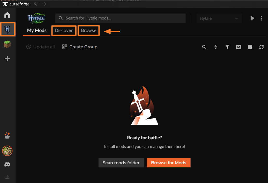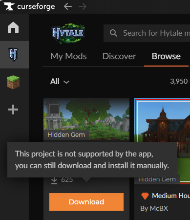 Open the Hytale page in the CurseForge app and click Discover or Browse