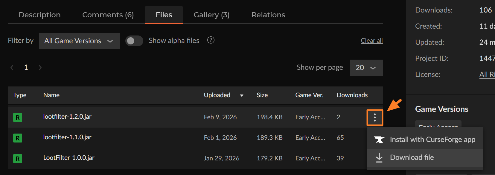 You can either click on Install via app to open the CurseForge app and start the download or click the dropdown menu next to Install via app, then select Download file manually