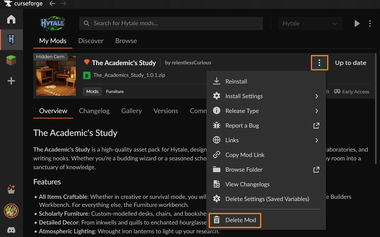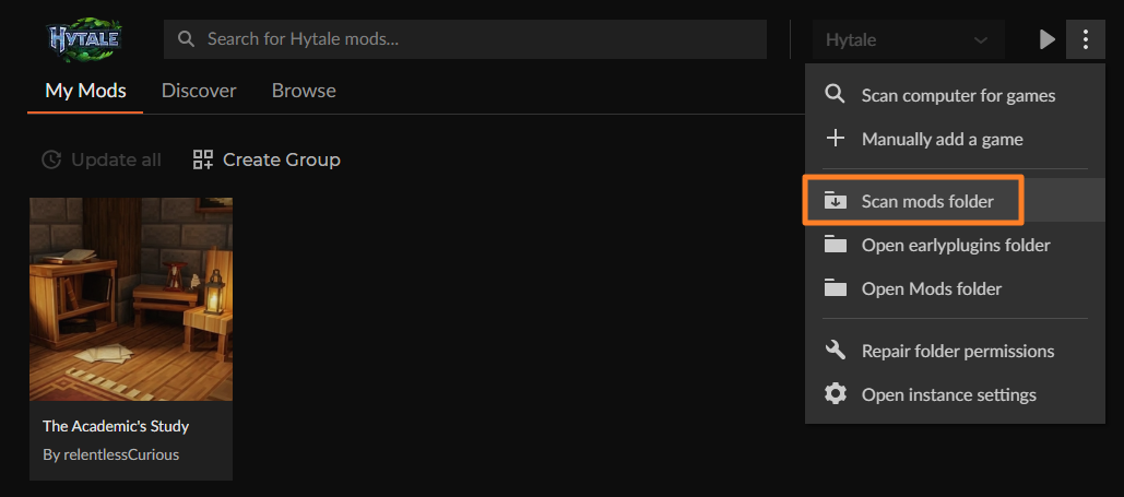 You can install Hytale mods directly through the CurseForge app by following these steps:
